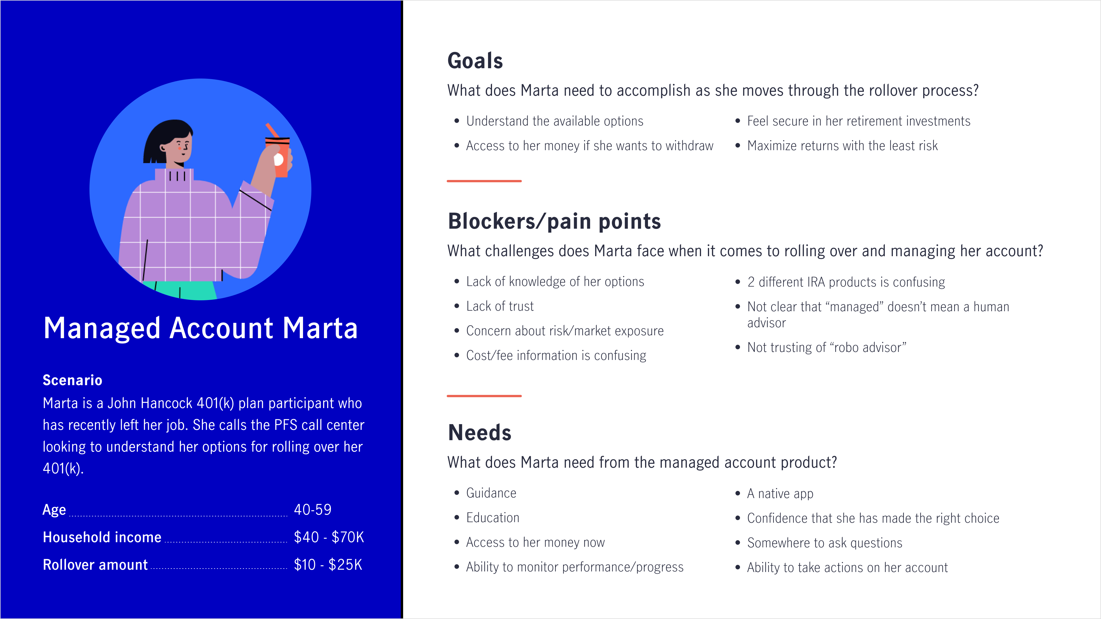 The business has a strategic goal with this product to retain customers who are leaving their John Hancock 401K after changing jobs. With the 401K customer funnel in mind, I also engaged with the call center that supports the 401K plan, to understand the goals and behaviors of those users.